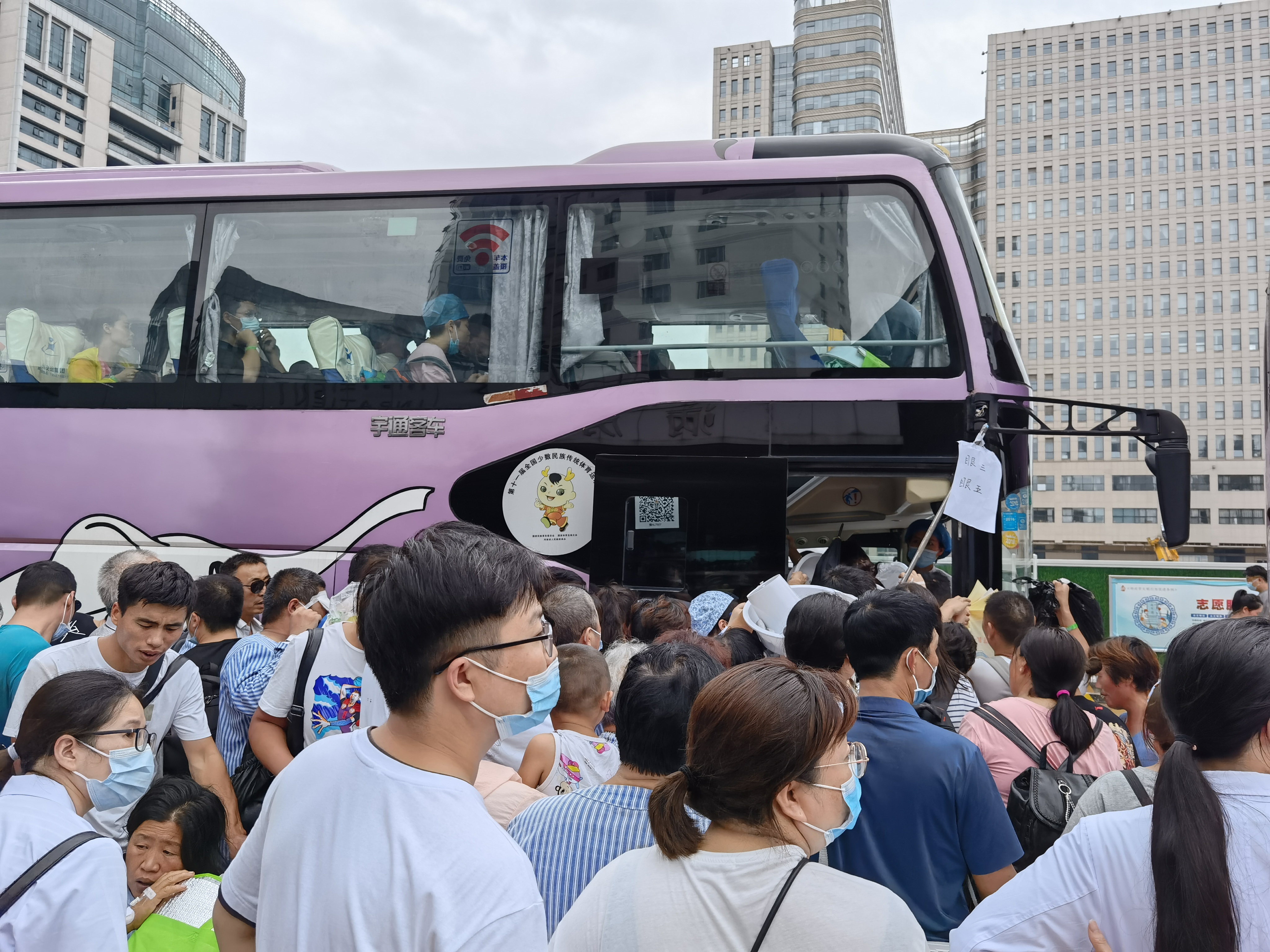 7月21日下午,郑大一附院河医院区1号住院楼外,等待上车转院的病人及家属。新京报记者 程亚龙 摄