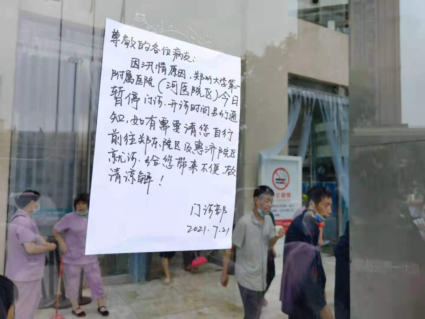 7月21日下午,郑大一附院河医院区门诊楼贴着的停诊通知。新京报记者 聂辉 摄