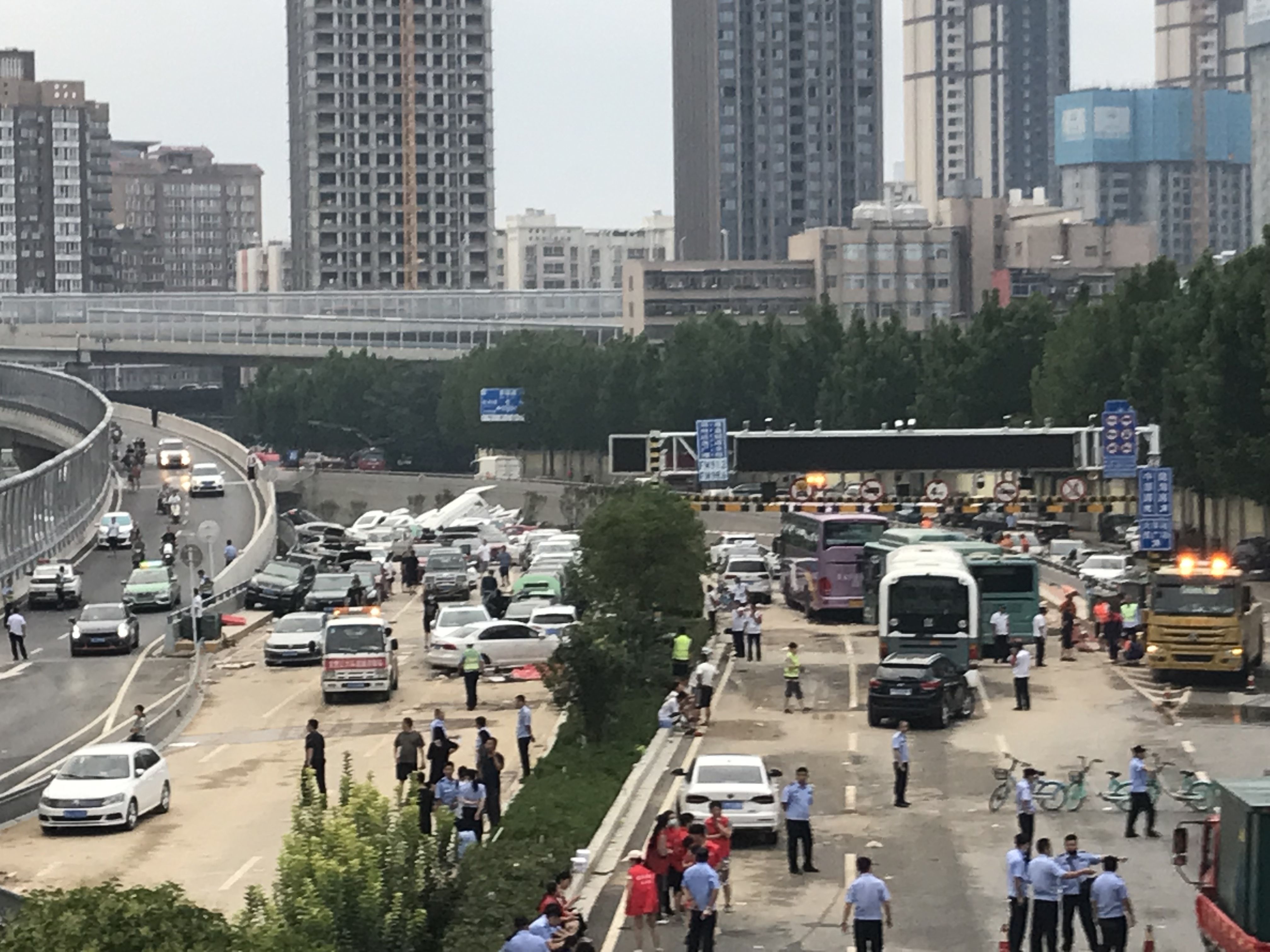 22日下午1点左右,京广北路隧道南口附近路段封闭,打捞隧道内被困车辆,新京报记者看到,数十辆车横七竖八堆在路面上。附近商店老板称,平日京广隧道来往车辆较多。