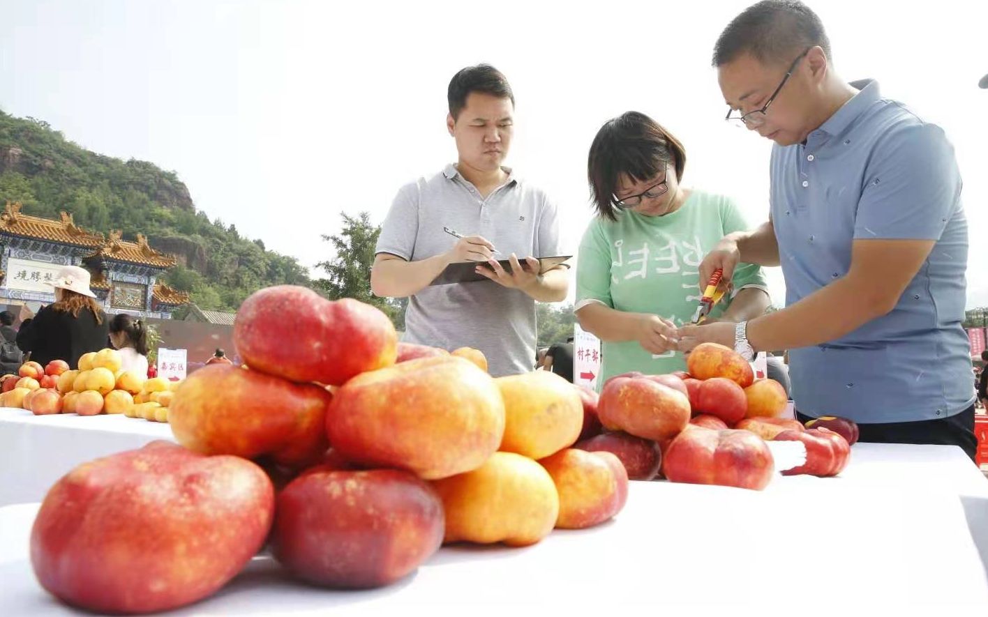 丫髻山太极广场上,油桃、蟠桃等刚刚下树的平谷大桃纷纷亮相。作为蟠桃会的重磅活动之一,今年的“甜桃王”擂台赛一改往年现场评比方式,经过村级初赛,44名果农入围,竞技镇级“甜桃王”评比资格。一大早儿,工作人员就提前在参赛农户的桃园里现场摘桃、称重、测糖度,进行全程跟踪记录。最终,平均含糖量18.7度,最高含糖量20.7度,刘家店镇胡店村杨士明等3人获得甜桃王一等奖。39名2020年度“诚信之星”和1个“诚信村”同步获得表彰。