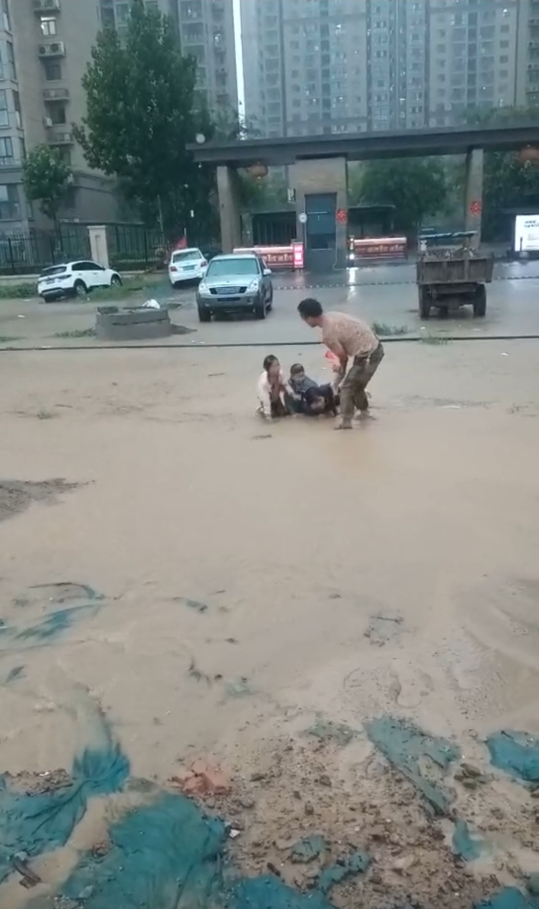 7月20日,“郑州一家三口掉进积水坑,路人舍命相救”的视频在网上流传。视频中,一名男子跪在被泥水淹没的马路上,从一处坑里拉出两个孩子,又用力将一个成年女子从坑中拖出。