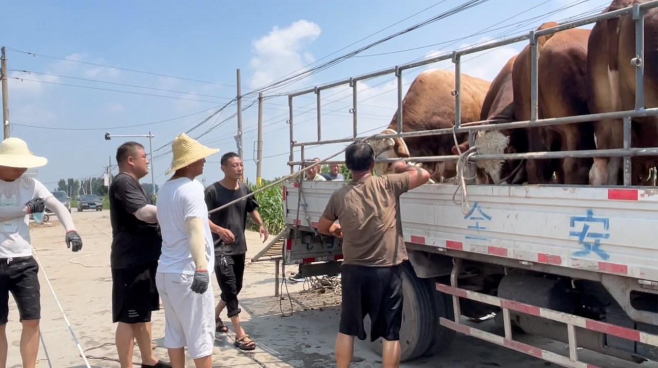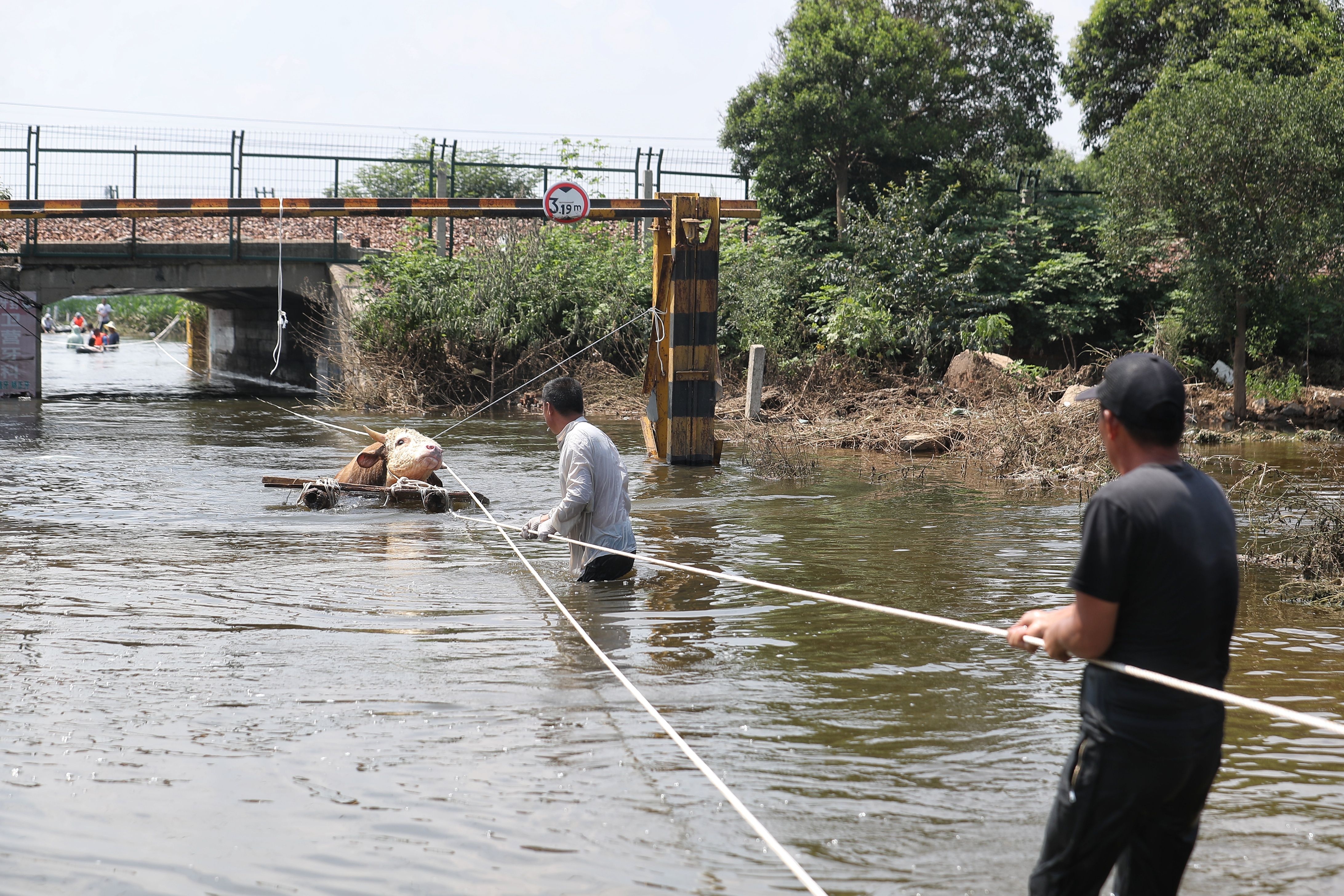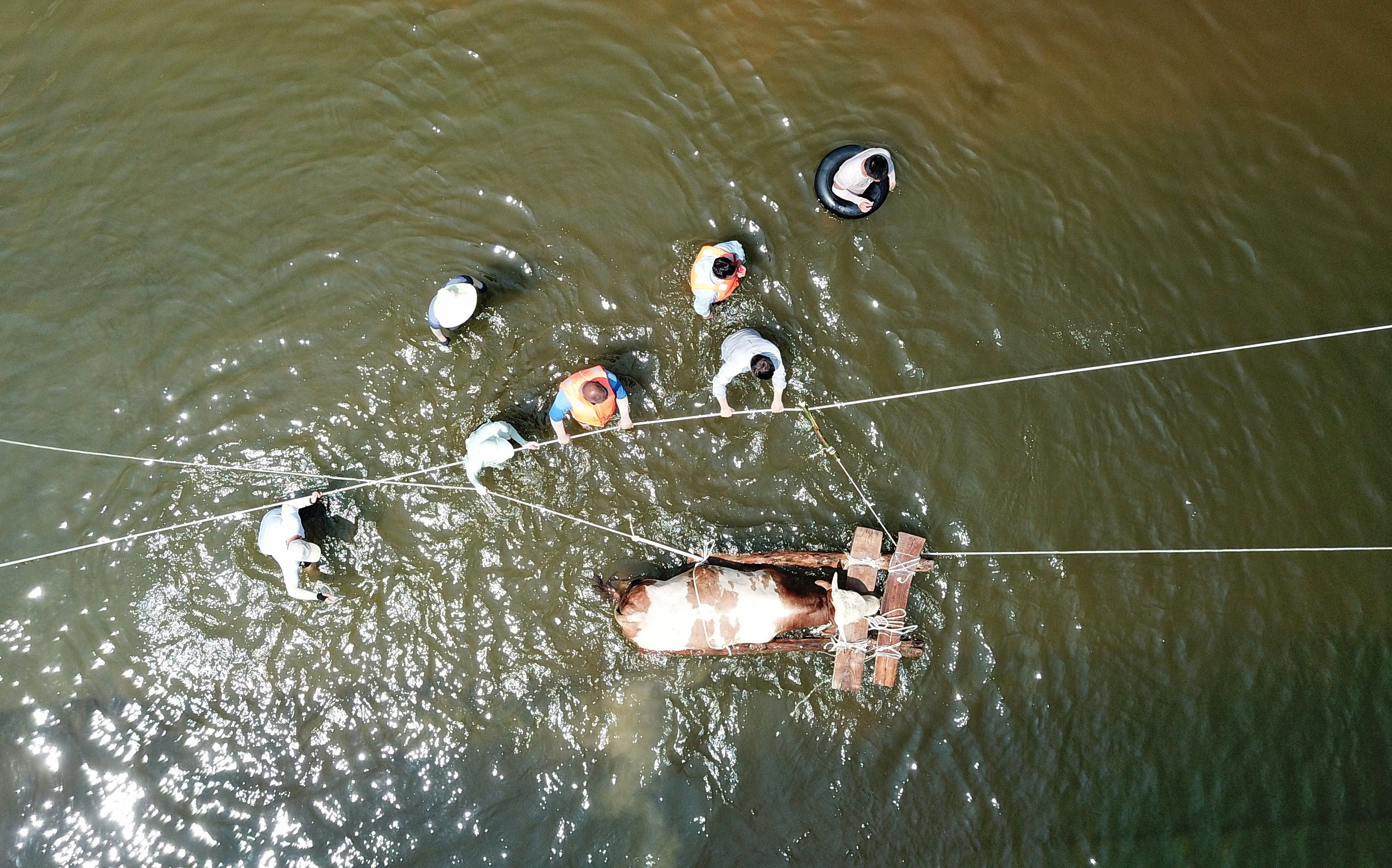 牛被放在由两根木头和两块桐木板制成的简易木筏上,通过救援绳拉到岸上。一部分村民负责站在深水区中转运,另一部分人在水未淹没的位置,将木筏拉至岸边。被拉到岸上的牛将通过货车转移到田庄村北部5公里左右的南洼村。