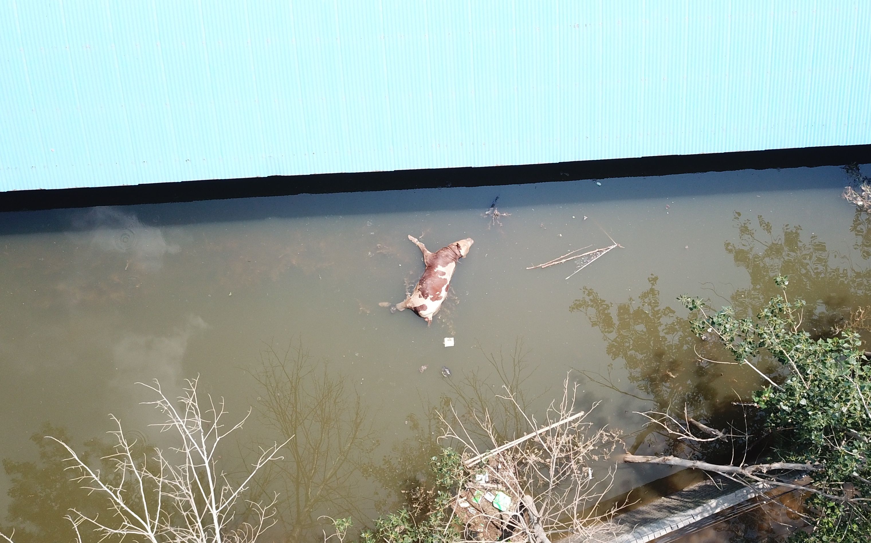 7月26日,未及时转移的牛淹死后漂浮在水面上。新京报记者 王飞 摄