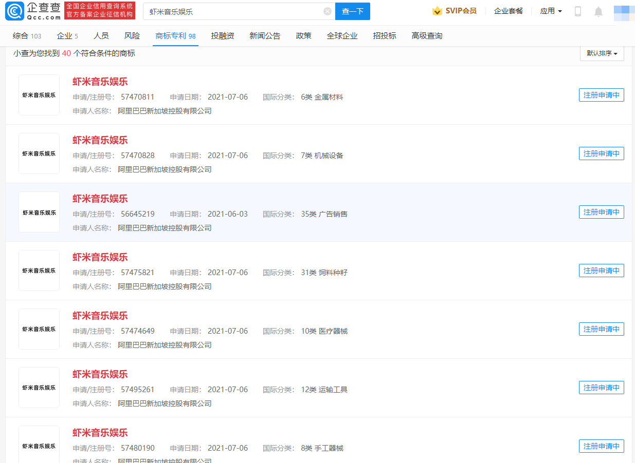 企查查APP 显示,近日,阿里巴巴通过旗下阿里巴巴新加坡控股有限公司申请了多个“虾米音乐娱乐”商标,国际分类涉及38类 通讯服务、35类 广告销售等,目前商标状态均为注册申请中。