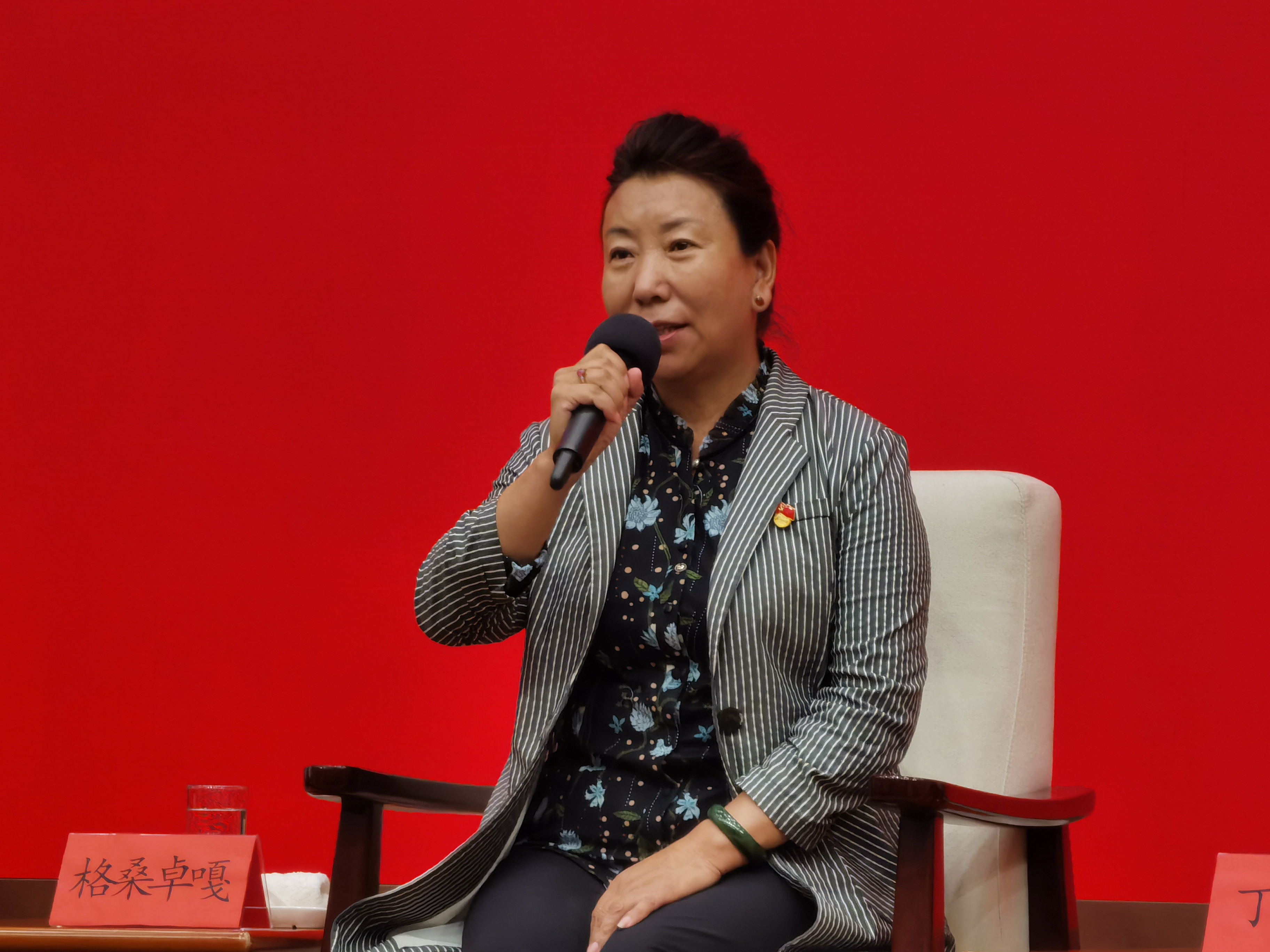 7月27日,格桑卓嘎在见面会上发言。新京报记者 陈琳 摄