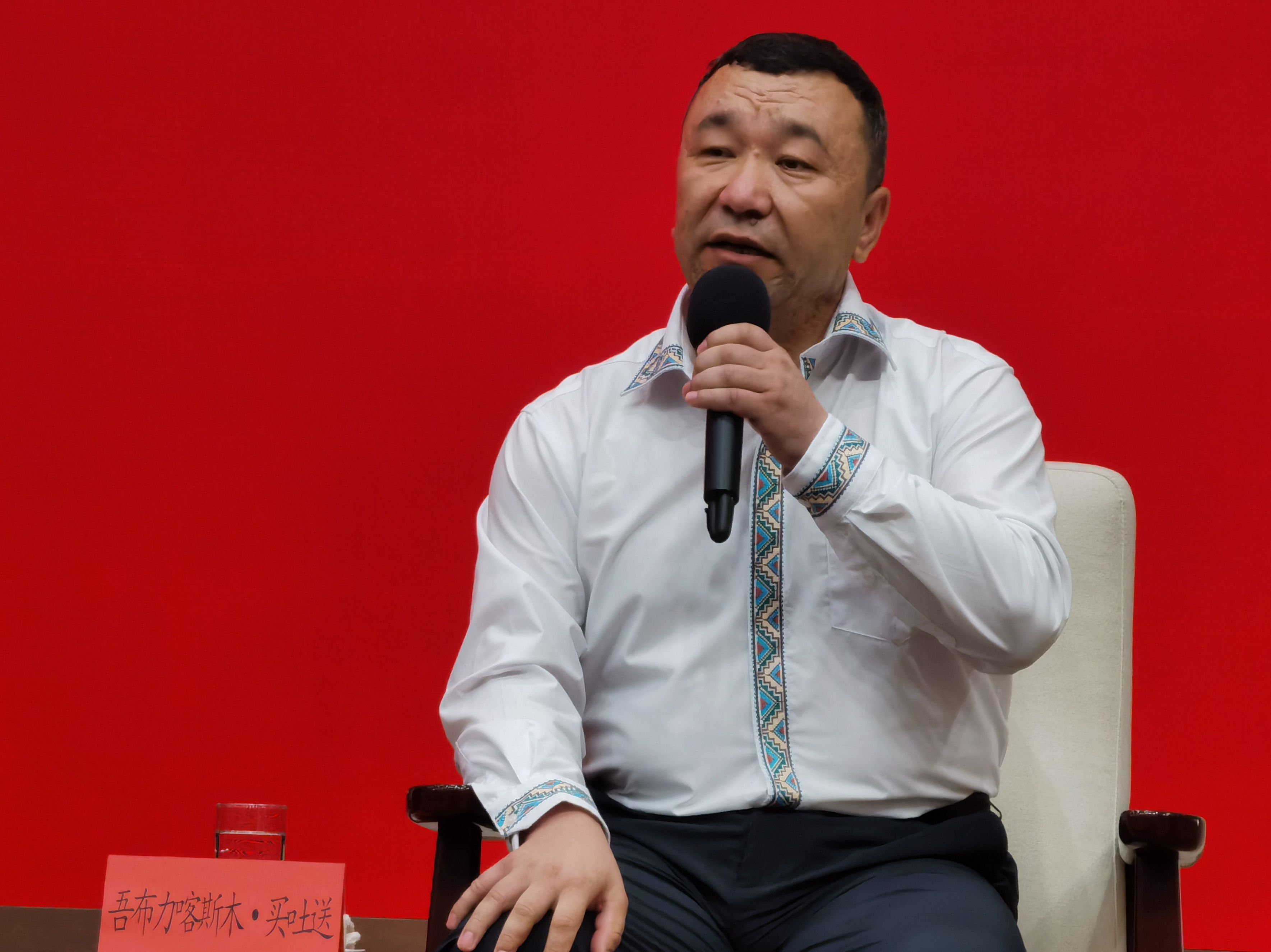 7月27日,吾布力喀斯木·买吐送在见面会上发言。新京报记者 陈琳 摄
