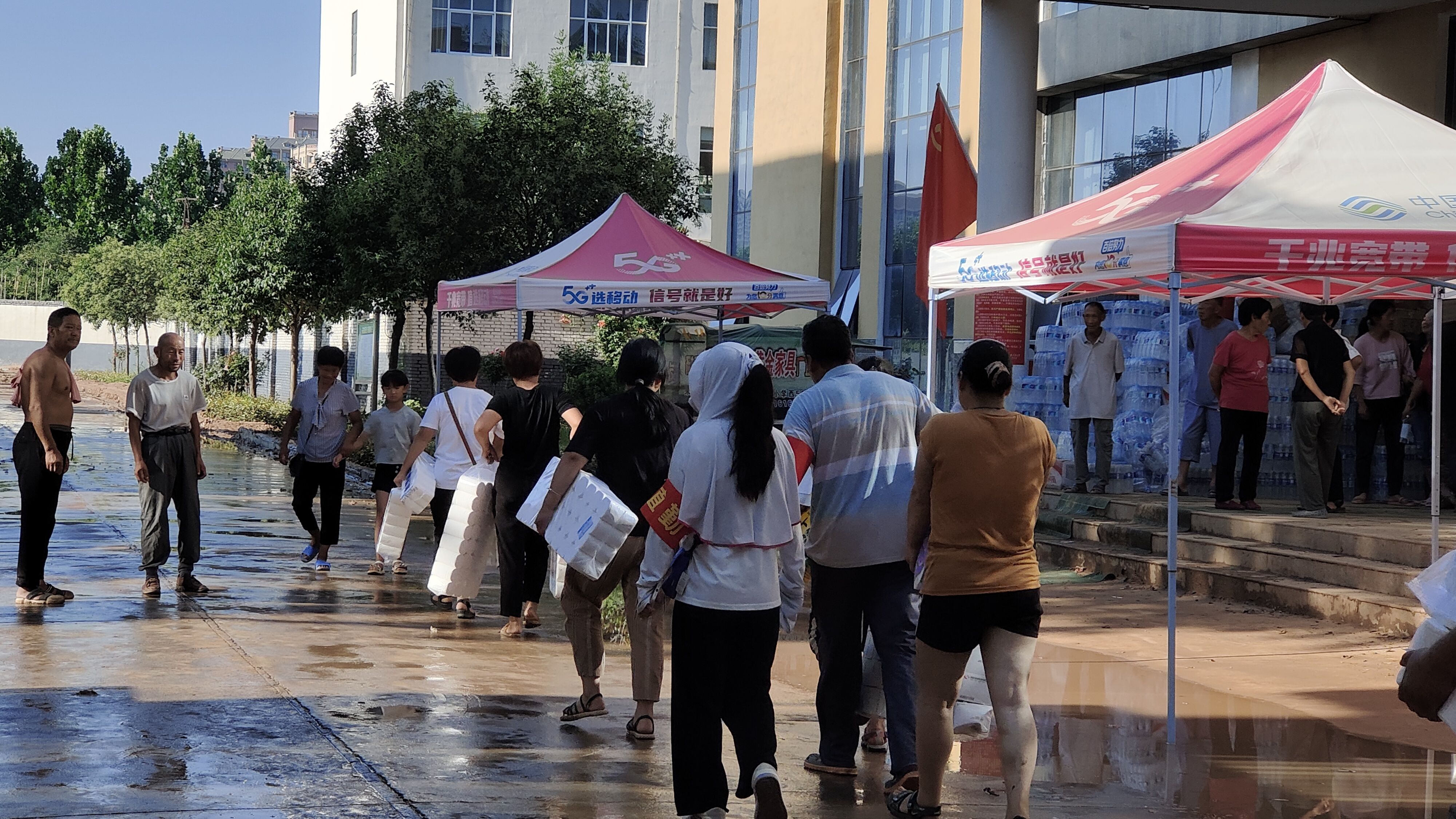 7月26日,淇县职业中专安置点内,村民们领走卫生纸等物资。新京报记者 刘瑞明 摄