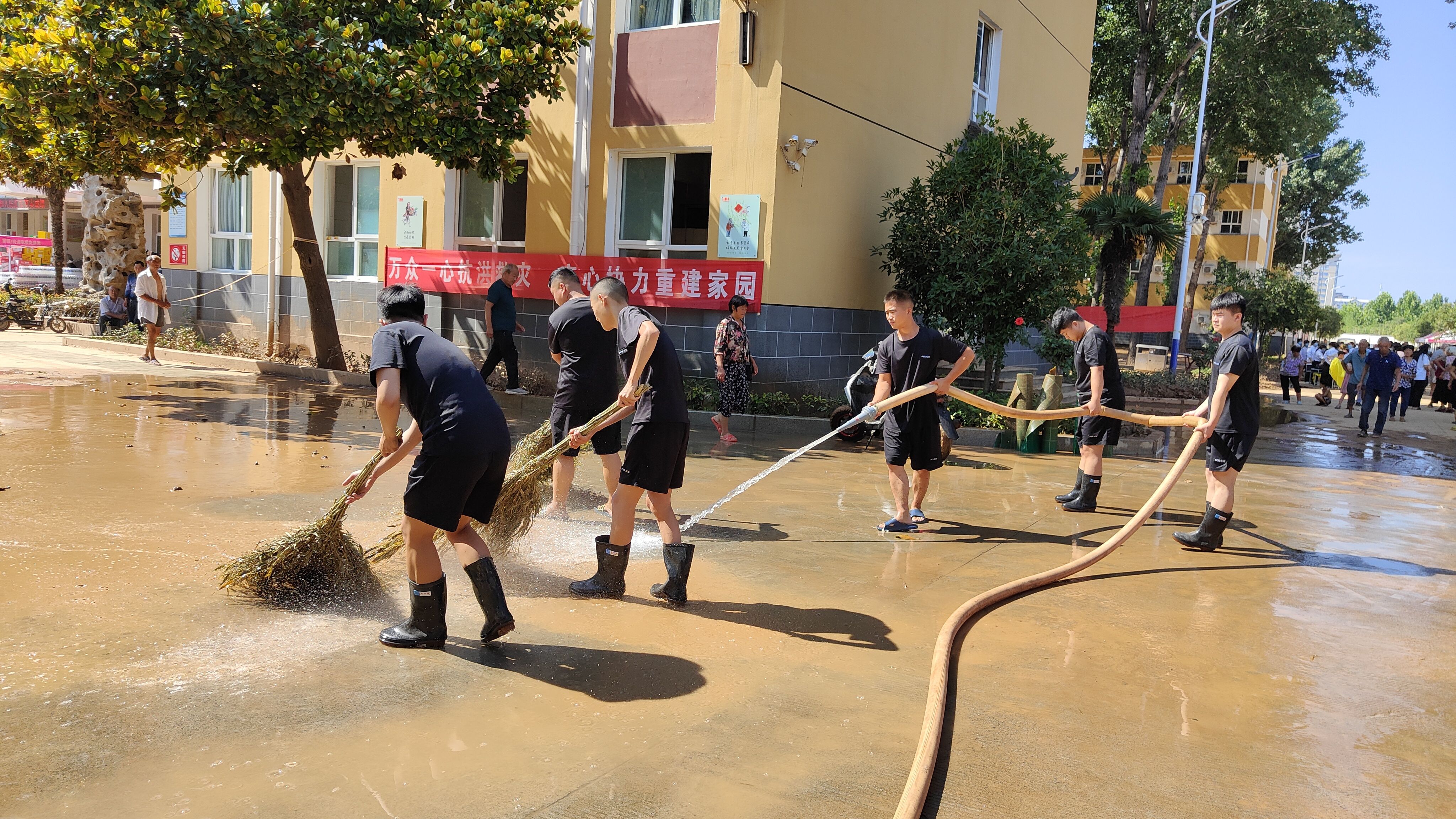 7月26日,淇县职业中专安置点内,工作人员正在清洗路面。新京报记者 刘瑞明 摄