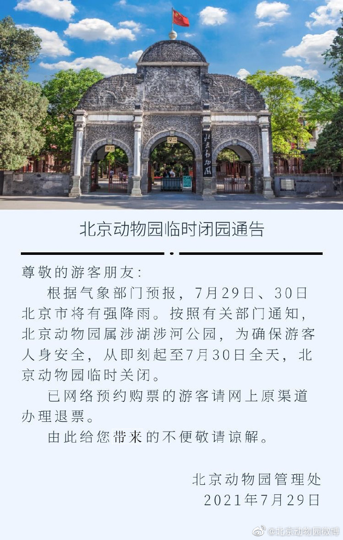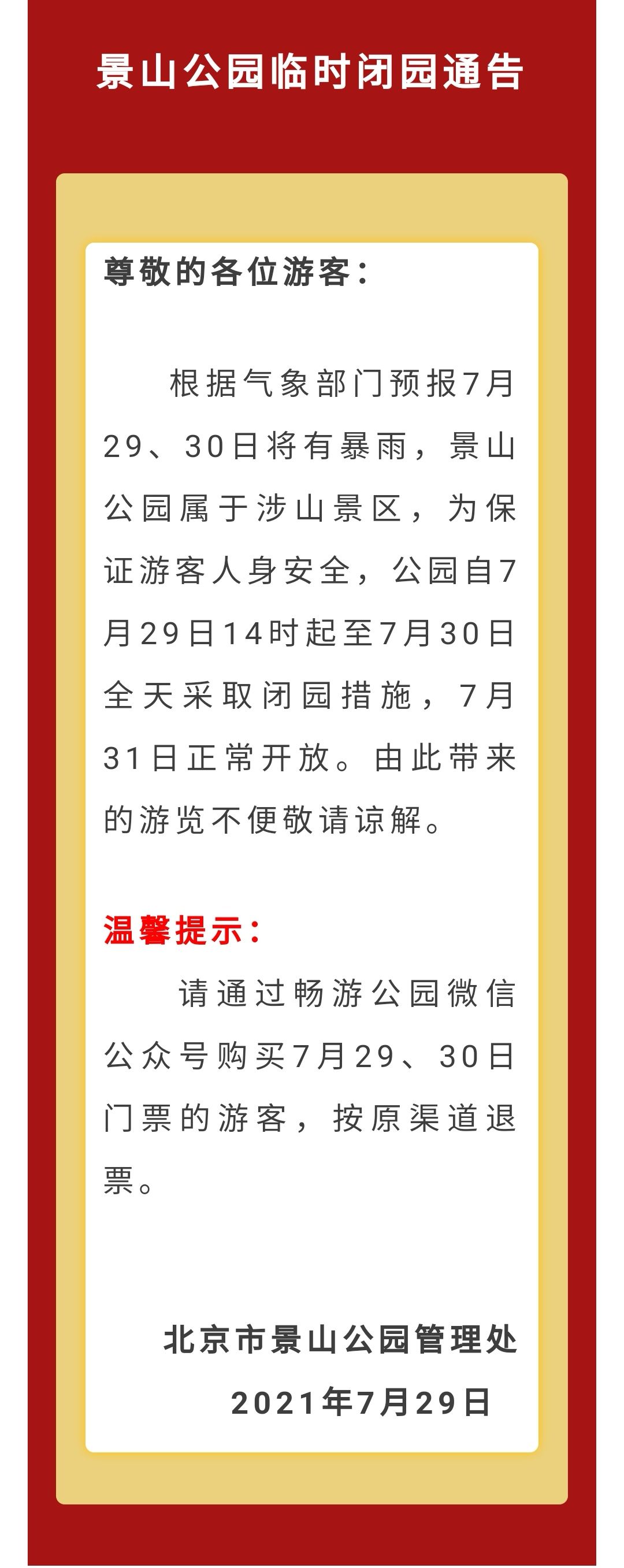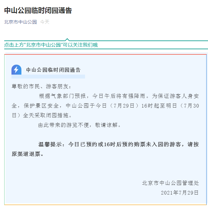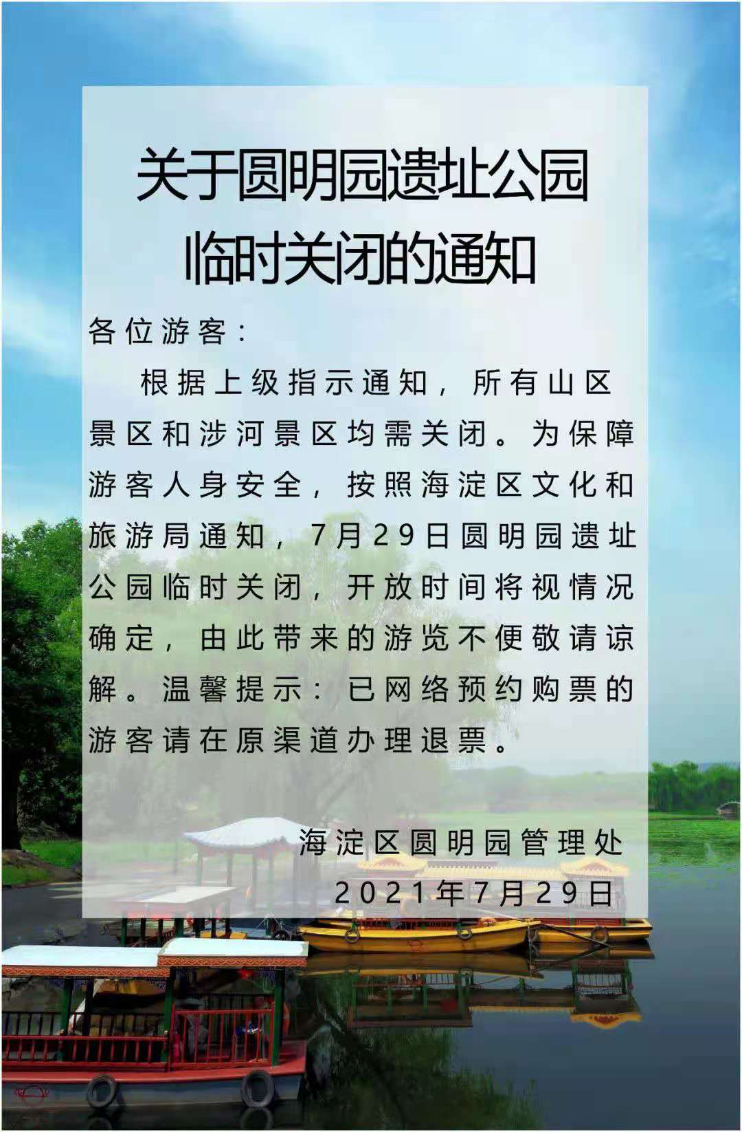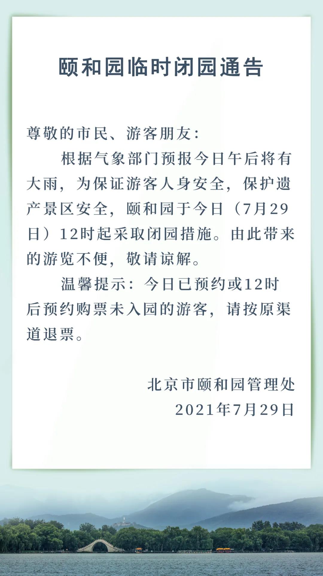 新京报快讯 7月29日,受强降雨影响,北京颐和园公园、北海公园、圆明园遗址公园等均发布临时闭园的通知。以下为详细内容: