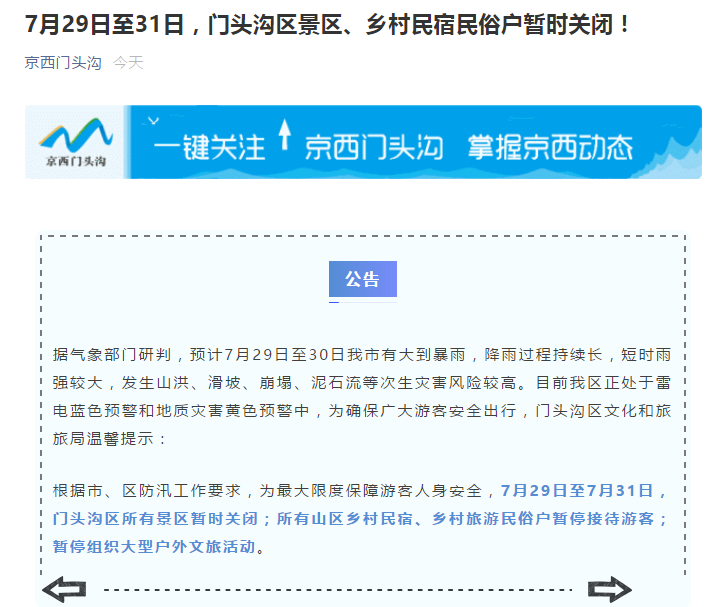 根据市、区防汛工作要求,为最大限度保障游客人身安全,7月29日至7月31日,门头沟区所有景区暂时关闭;所有山区乡村民宿、乡村旅游民俗户暂停接待游客;暂停组织大型户外文旅活动。