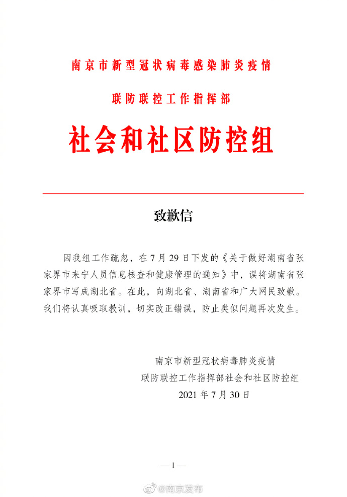新京报快讯 据@南京发布微博消息,因我组工作疏忽,在7月29日下发的《关于做好湖南省张家界市来宁人员信息核查和健康管理的通知》中,误将湖南省张家界市写成湖北省。在此,向湖北省、湖南省和广大网民致歉。我们将认真吸取教训,切实改正错误,防止类似问题再次发生。