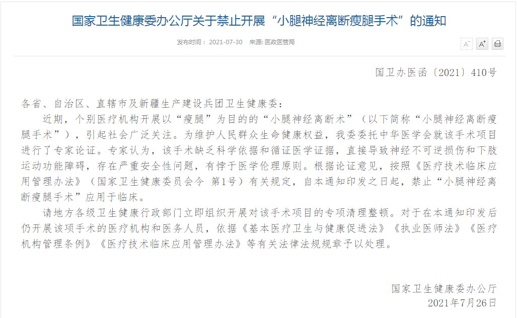 原标题:国家卫生健康委办公厅关于禁止开展“小腿神经离断瘦腿手术”的通知
