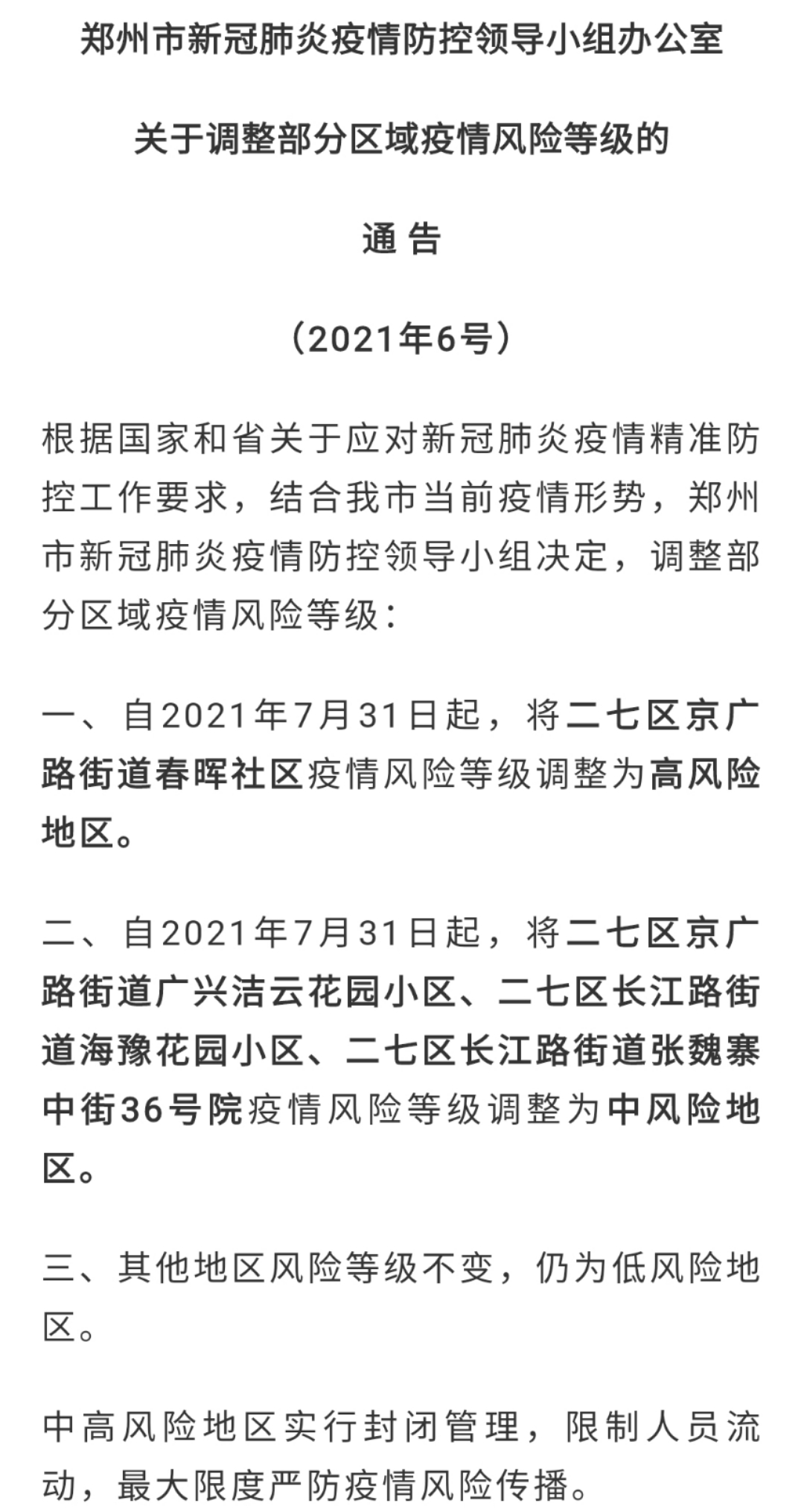 自7月31日起,将郑州市二七区京广路街道春晖社区疫情风险等级调整为高风险地区,将二七区京广路街道广兴洁云花园小区、二七区长江路街道海豫花园小区、二七区长江路街道张魏寨中街36号院疫情风险等级调整为中风险地区。