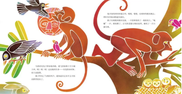 这是一则句式不断重复,故事情节不断推进的非洲民间故事。一天,蚊子向鬣蜥吹了个小牛皮,鬣蜥不想听小蚊子唧唧歪歪,就找了一根棍子把耳朵塞住;蟒蛇和鬣蜥打招呼,但鬣蜥没听见,蟒蛇以为鬣蜥生气了,于是他冲进小兔子的窝;小兔子慌了,四处跑起来,乌鸦看到小兔子以为发生了什么大事……就这样雪球越滚越大,竟引起了一起惊天动地的大灾难,最后还好有狮王出来主持公道,原来最初就是蚊子的嗡嗡叫。类似这样环环相扣的故事还有《母鸡萝丝去散步》。