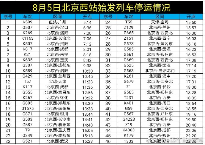 8月5日北京西站46趟始发列车停运