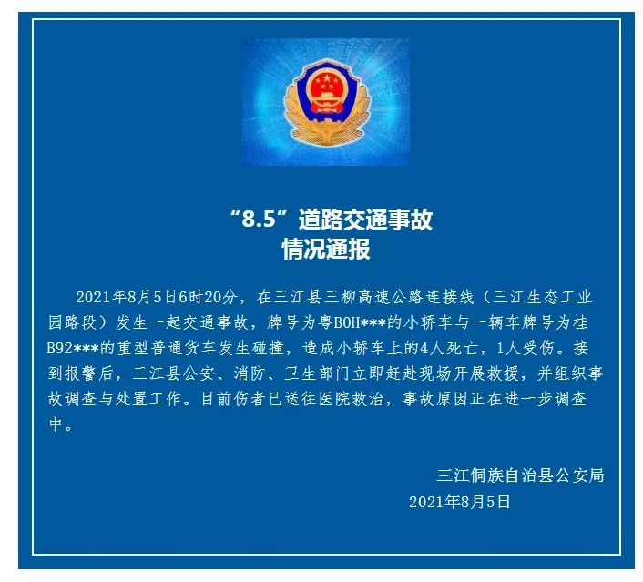 据央视新闻消息,8月5日6时20分,在广西三江侗族自治县三柳高速公路连接线(三江生态工业园路段)发生一起交通事故,牌号为粤B0H***的小轿车与一辆车牌号为桂B92***的重型普通货车发生碰撞,造成小轿车上的4人死亡,1人受伤。接到报警后,三江县公安、消防、卫生部门立即赶赴现场开展救援,并组织事故调查与处置工作。目前伤者已送往医院救治,事故原因正在进一步调查中。