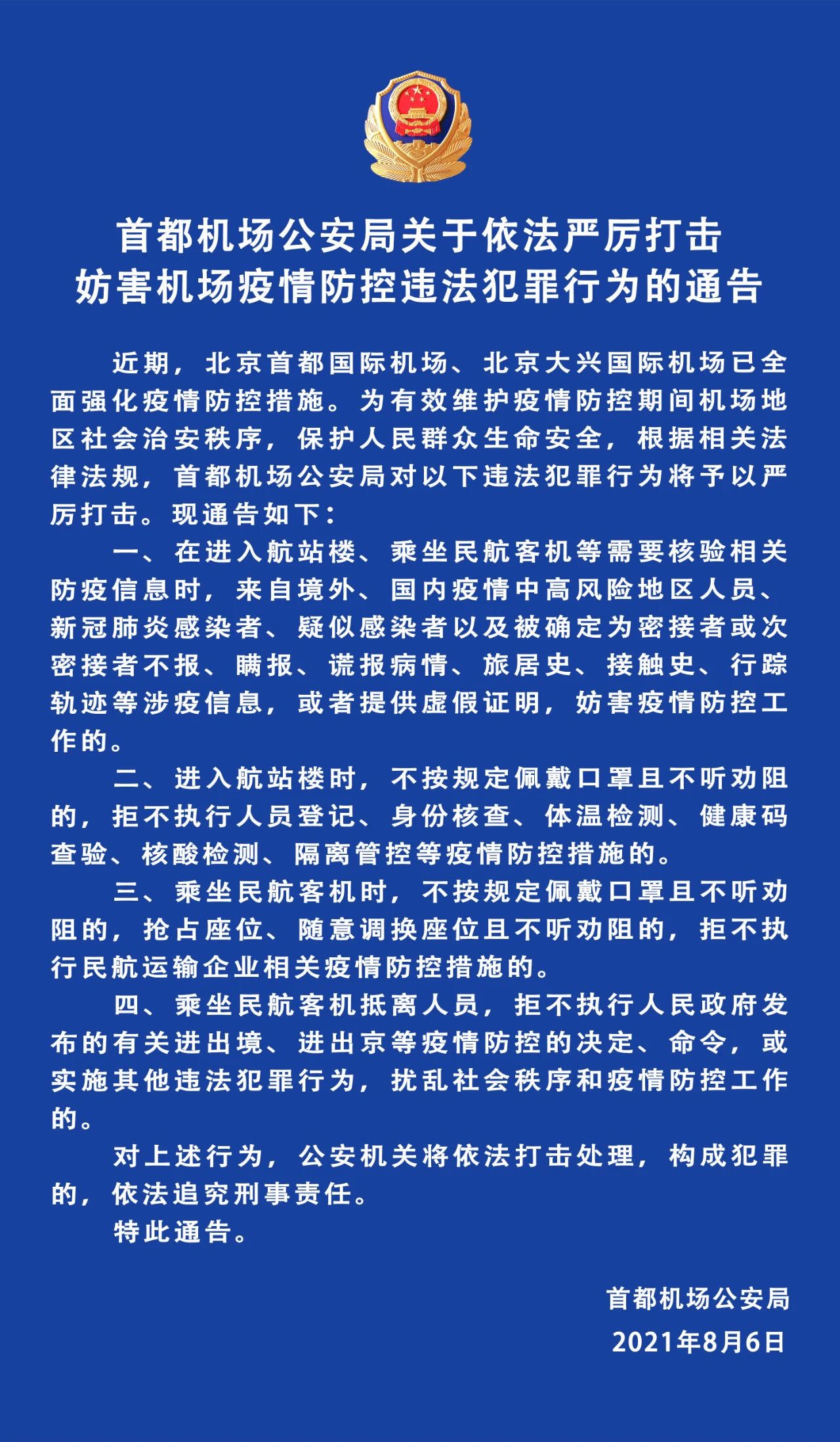 新京报快讯 据首都机场公安局官微消息,首都机场公安局发布关于依法严厉打击妨害机场疫情防控违法犯罪行为的通告,内容如下: