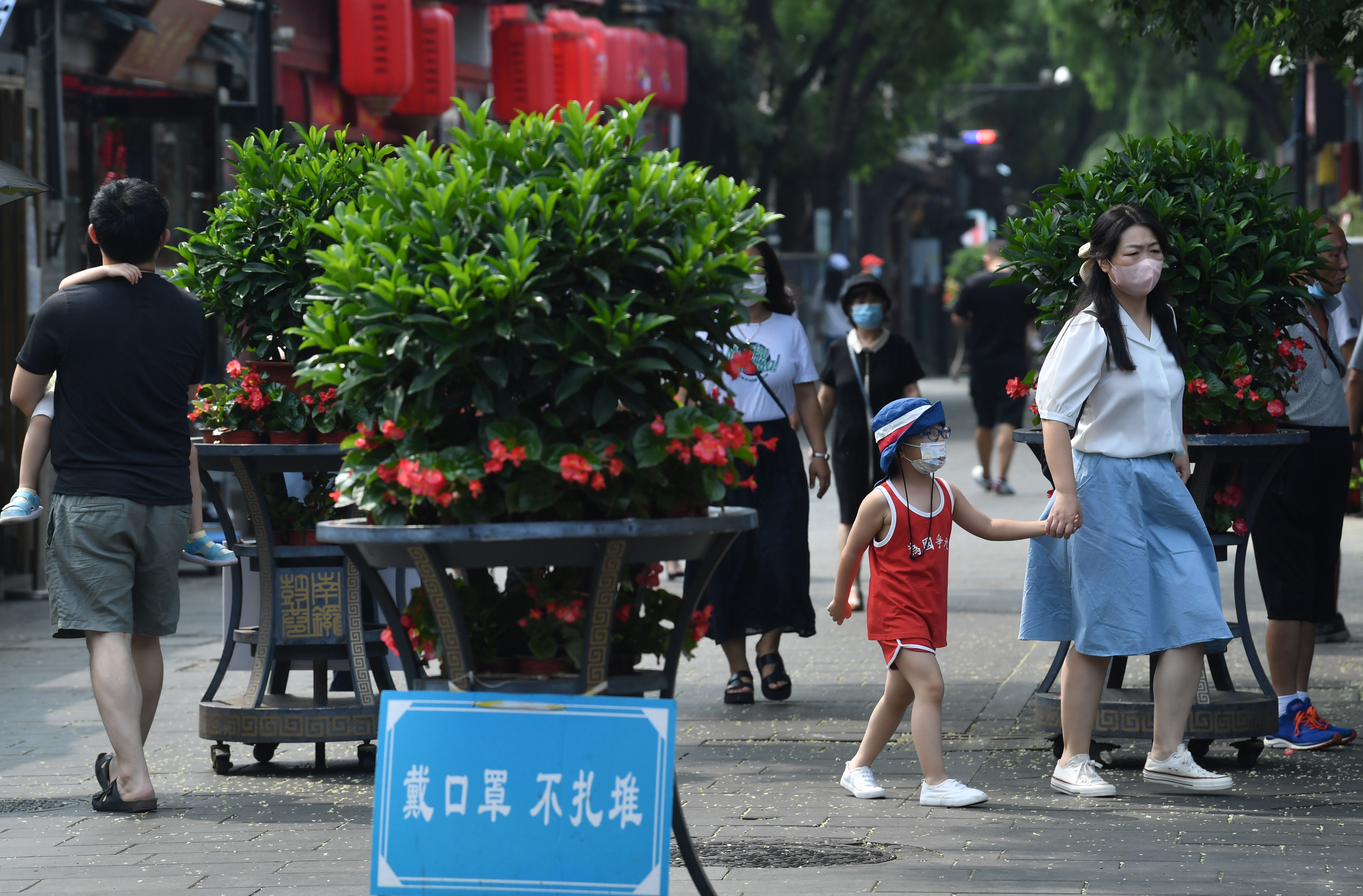 ▲8月7日,北京南锣鼓巷,通过标识牌和喇叭循环播放,提醒游客佩戴口罩,保持安全距离,不聚集、不扎堆。 新京报记者 李木易 摄影