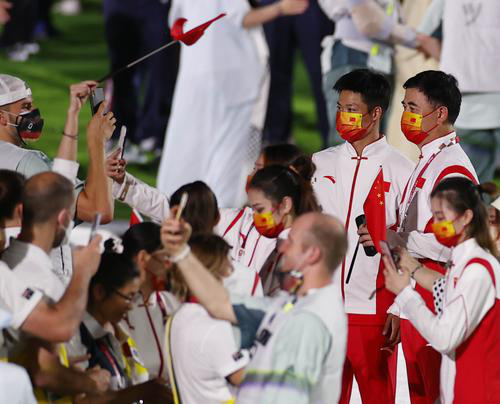 8月8日,第32届夏季奥林匹克运动会闭幕式在日本东京举行。这是中国代表团成员在闭幕式上(8月8日摄)。新华社记者 王丽莉 摄