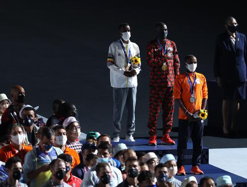 这是肯尼亚选手基普乔格、荷兰选手纳杰耶、比利时选手阿卜迪在闭幕式举行的颁奖仪式上,他们分获东京奥运会男子马拉松的冠亚季军。