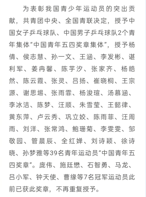 新京报讯 据共青团中央官方微博昨日消息,为表彰我国青少年运动员在东京奥运会的突出贡献,共青团中央、全国青联决定,授予中国女子乒乓球队、中国男子乒乓球队2个青年集体“中国青年五四奖章集体”,授予杨倩、侯志慧、孙一文等39名青年运动员“中国青年五四奖章”。以下为具体名单: