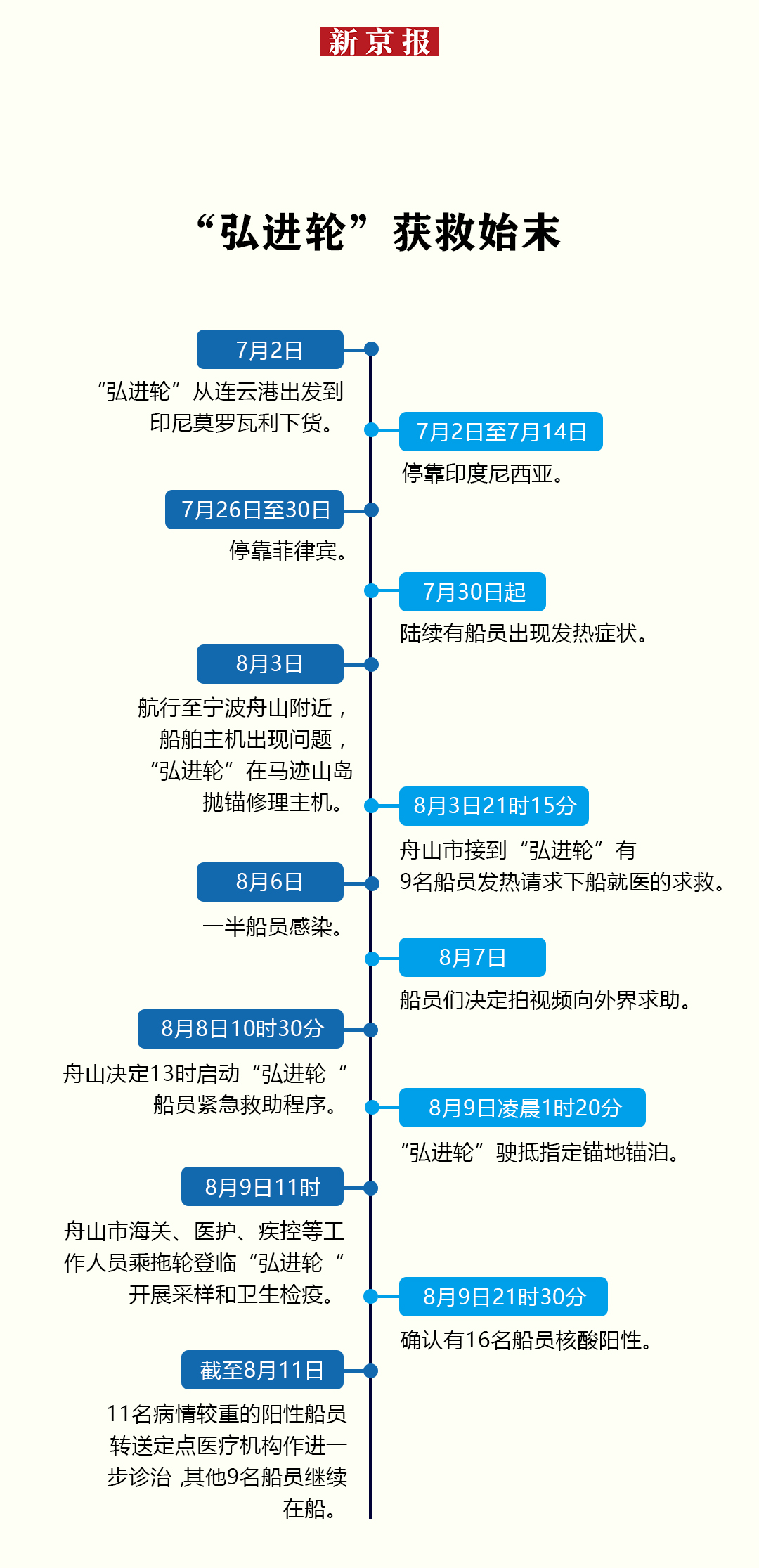7月31日,二管、三管、机工、大厨同时出现发热症状。“弘进轮”在发现疑似疫情后,立刻给船管公司和代理公司汇报情况,并且尽力保证消毒和隔离,但是依然无法阻挡发热蔓延。“到了周三(8月4日),已经有8个船员发烧。”周念安用“沦陷”形容此时的“弘进轮”,“到8月6日,船上2个厨师全倒了。船员倒了一半,已经没法做隔离措施。”8月9日,舟山相关部门登船对船员核酸检测,确认16人核酸阳性。“弘进轮”获救始末:20中国船员16人核酸阳性,11人已送医
