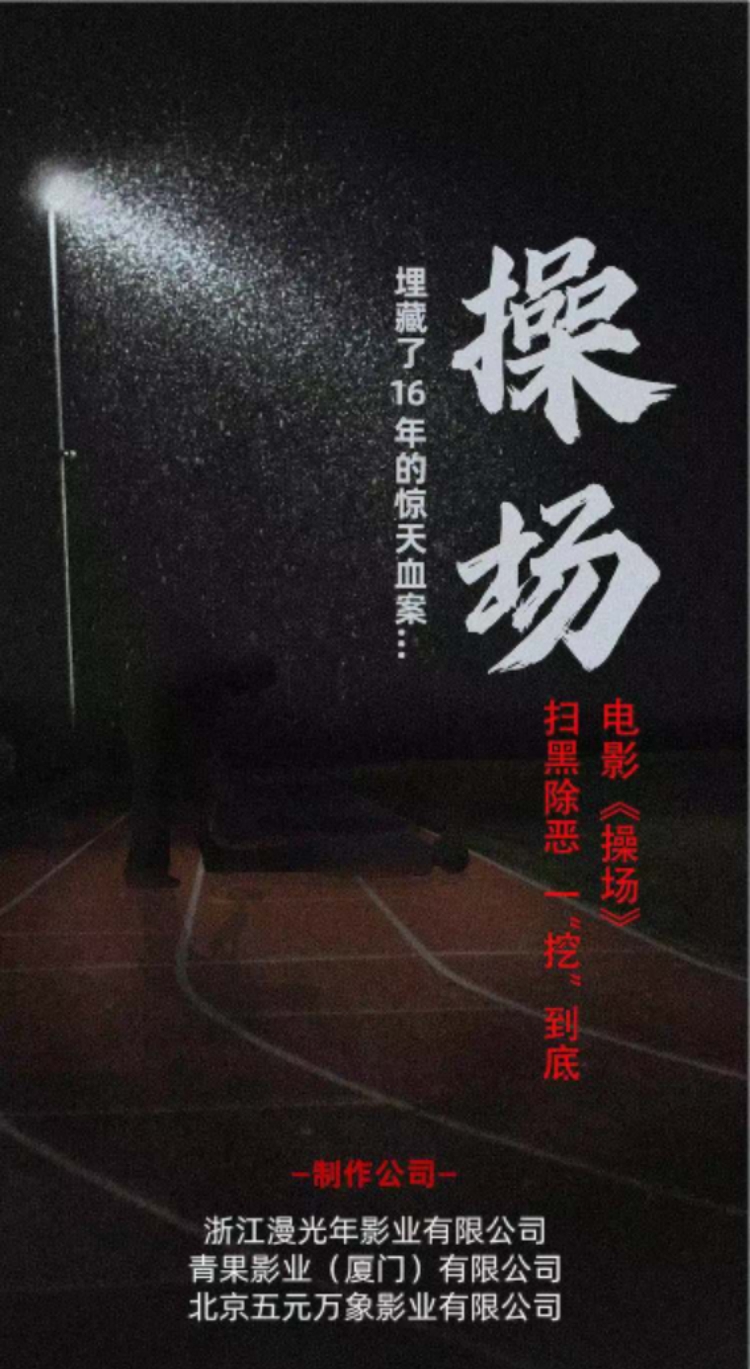 《操场》在国家电影局备案公示信息显示,故事讲述的是:“新光县第一中学操场改扩建工程监理董一民老师,拒绝豆腐渣工程的‘合格验收’,被包工头杜立青及其同伙杀害并埋尸操场下。在中央督导组领导下,公安部门一举打掉了以杜立青为首的‘涉黑涉恶犯罪团伙’,给社会一个公平交代。”