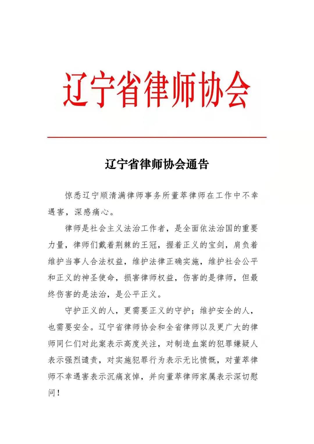 新京报快讯 据抚顺律师协会微信公众号消息,8月14日,辽宁顺清满律师事务所董萃律师在工作时不幸被害身亡。针对该事件,辽宁省律师协会发布了通告,全文如下: