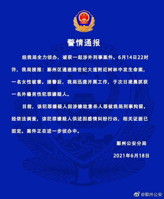 此前,宁波市公安局鄞州分局官方微博@鄞州公安于6月18日发布警情通报:宁波一外籍男子杀害一女子被捕,涉嫌故意杀人罪已刑拘。