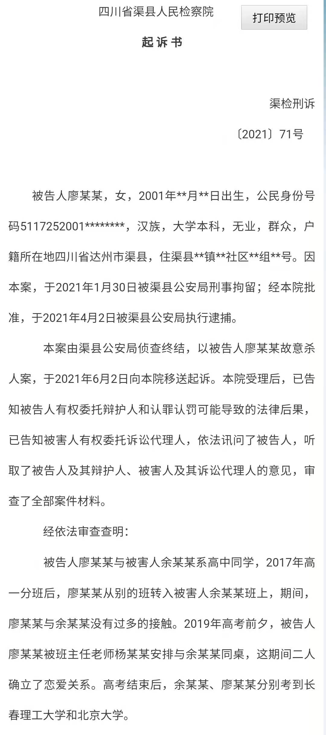 据渠检刑诉(2021)71号起诉书,廖某某(女)与余某某(男)系高中同学,2019年高考前夕,两人确立了恋爱关系。高考结束后,余某某、廖某某分别考到长春理工大学和北京大学。2020年7月,二人感情不和开始冷战。2020年11月,廖某某前往长春理工大学跳楼自杀未遂,后经双方家长在长春市的派出所调解才解决纠纷。2021年1月13日,廖某某雇用的两名未成年人马某某、保某某在余某某渠县家门口持折叠匕首捅伤余某某,然后逃走。经鉴定,被害人余某某人体损伤程度评定为轻伤二级。2021年1月30日,廖某某被渠县公安局刑事拘留。4月2日,被渠县公安局执行逮捕。6月,廖某某因涉嫌故意杀人,被渠县检察院提起公诉。