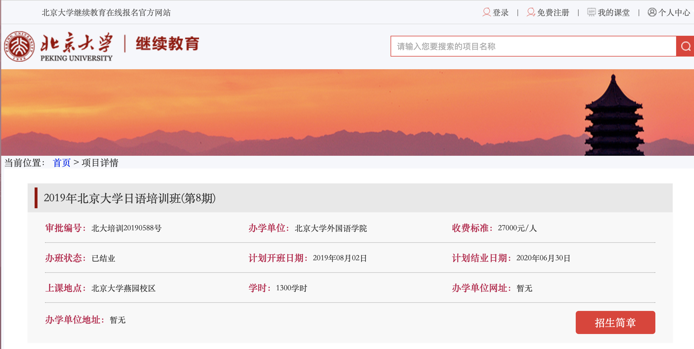 北京大学继续教育官网显示,北京大学日语培训班(第8期)计划开班日期是2019年8月2日,计划结业日期是2020年6月30日,目前已经结业。其办学单位是北京大学外国语学院,上课地点是北京大学燕园校区,收费标准是每人27000元。学员完成本培训班全部课程,考试合格后发给北京大学非学历培训项目“北京大学日语培训班”结业证书。