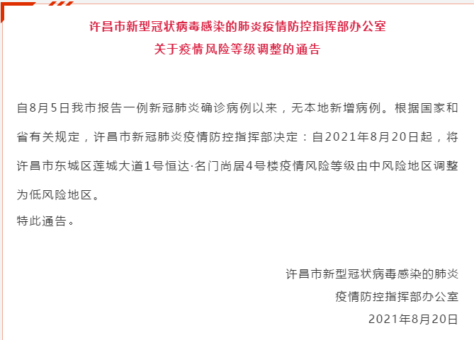 新京报快讯 据健康许昌微信公众号消息,自8月5日许昌市报告一例新冠肺炎确诊病例以来,无本地新增病例。根据国家和省有关规定,许昌市新冠肺炎疫情防控指挥部决定:自2021年8月20日起,将许昌市东城区莲城大道1号恒达·名门尚居4号楼疫情风险等级由中风险地区调整为低风险地区。