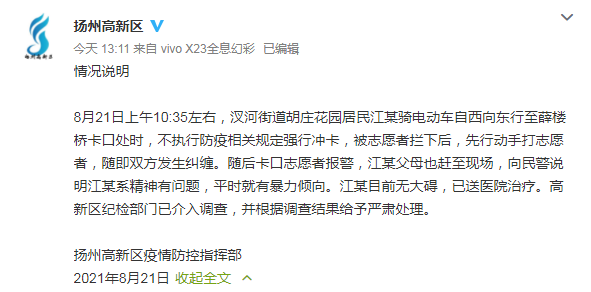 新京报快讯 据@扬州高新区微博消息,8月21日上午10:35左右,汊河街道胡庄花园居民江某骑电动车自西向东行至薛楼桥卡口处时,不执行防疫相关规定强行冲卡,被志愿者拦下后,先行动手打志愿者,随即双方发生纠缠。随后卡口志愿者报警,江某父母也赶至现场,向民警说明江某系精神有问题,平时就有暴力倾向。江某目前无大碍,已送医院治疗。高新区纪检部门已介入调查,并根据调查结果给予严肃处理。