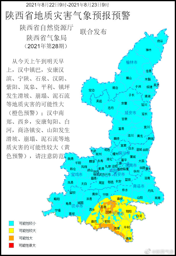 预计2021年8月22日9时至2021年8月23日9时,汉中镇巴,安康汉滨、宁陕、石泉、汉阴、紫阳、岚皋、平利、镇坪发生滑坡、崩塌、泥石流等地质灾害的可能性大(橙色预警);汉中南郑、西乡,安康旬阳、白河,商洛镇安、山阳发生滑坡、崩塌、泥石流等地质灾害的可能性较大(黄色预警),请注意防范。
