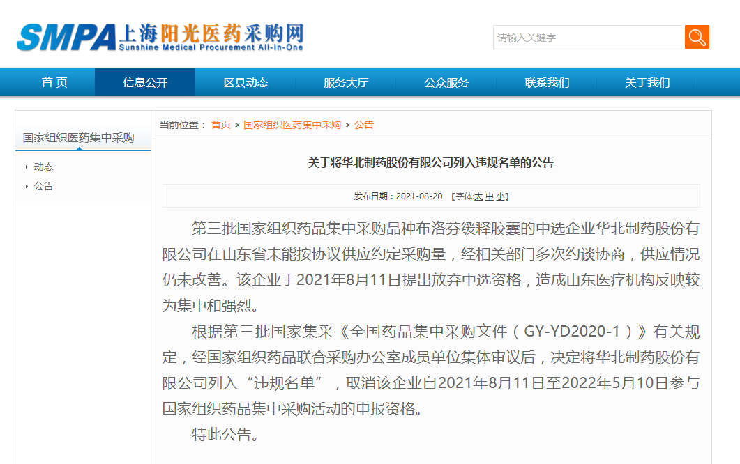 8月20日,上海阳光采购网发布公告表示,因华北制药在山东省未能按协议供应约定采购量,国家组织药品联合采购办公室成员单位集体审议后,决定将华北制药股份有限公司列入“违规名单”。