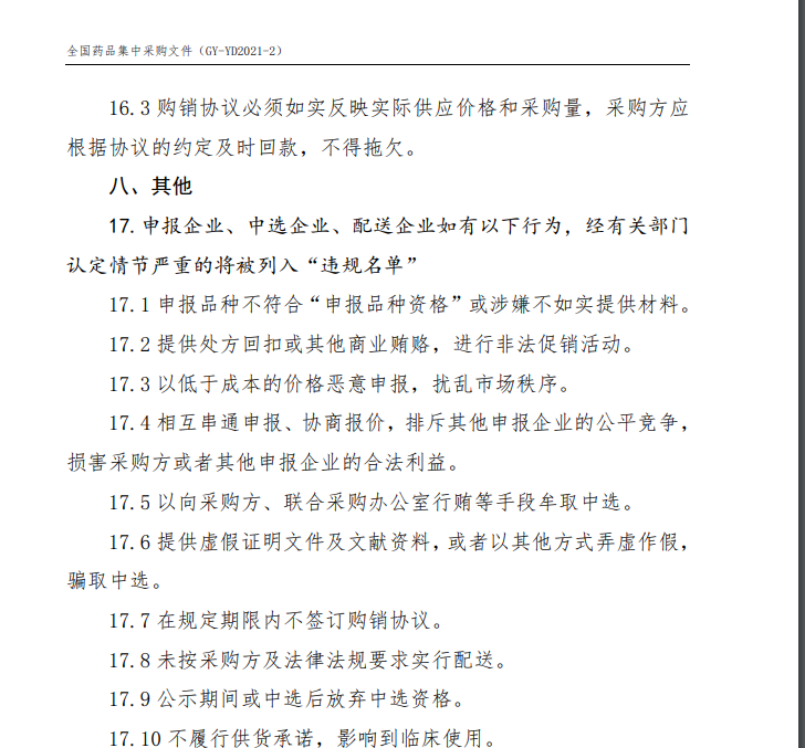 在全国药品集中采购文件(GY-YD2020-1)中,对申报企业、中选企业、配送企业明确了15条违规行为,其中包括,有以低于成本的价格恶意申报,扰乱市场秩序;在规定期限内不签订购销协议;公示期间或中选后放弃中选资格、不履行供货承诺,影响到临床使用等行为。经有关部门认定,情节严重的将会被列入“违规名单”。