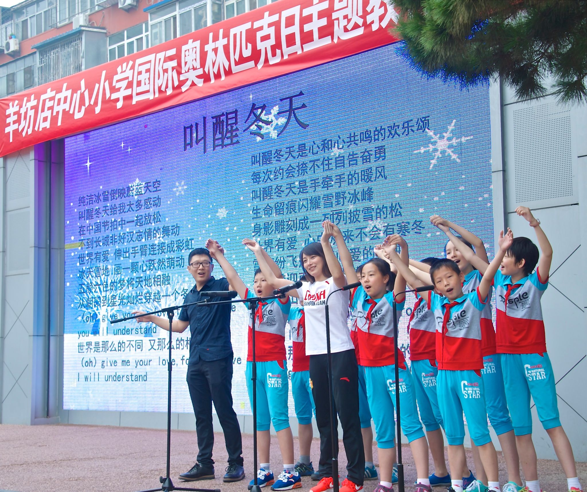 2015年6月,李妮娜来到海淀区羊坊店中心小学参加申冬奥歌曲进校园活动。受访者供图