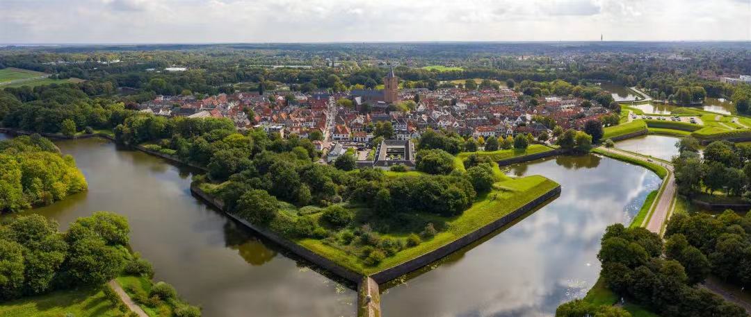 纳尔登是一座古老的堡垒,距离阿尔梅勒9公里,从上空俯瞰时,是多角星星的形状。游客可以漫步在星芒状街道间,从城镇的一端走向另一端,或是骑上一辆单车,穿行于纳尔登的大街小巷中。据说,纳尔登在10世纪时是港口,17世纪时作为防御阵地,被设计成特别的防御工事,外围增加了护城河,大大增强了防御能力。这些早已废弃的防御体系经过修缮,如今已经成为人气打卡地,甚至是颇受年轻人青睐的“古典婚礼”举办地。这里最古老的建筑是建于15世纪的大教堂,也是荷兰现存最古老的教堂之一,登上钟楼,可以看到童话般的美景。
