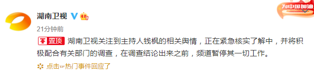 新京报快讯 据@湖南卫视消息,湖南卫视关注到主持人钱枫的相关舆情,正在紧急核实了解中,并将积极配合有关部门的调查,在调查结论出来之前,频道暂停其一切工作。