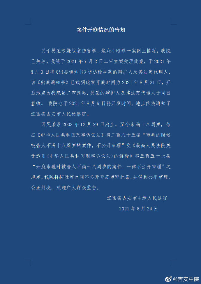 新京报快讯 据@吉安中院微博8月24日消息,针对媒体报道的江西吉安少年吴某遭持刀围殴反杀一人被判10年一案,江西省吉安市中级人民法院通报称,该院于7月2日二审立案受理此案,8月9日将《出庭通知书》送达给吴某的辩护人及法定代理人,该《出庭通知书》已载明此案开庭时间为8月31日。因吴某系2003年12月29日出生,至今未满十八周岁,依据相关法律规定,将按既定时间不公开开庭审理此案,并做到公平审理、公正判决。