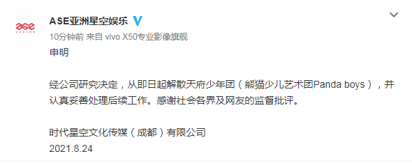 新京报快讯 据@ASE亚洲星空娱乐微博8月24日消息,时代星空文化传媒(成都)有限公司表示,“经公司研究决定,从即日起解散天府少年团(熊猫少儿艺术团Panda boys),并认真妥善处理后续工作。感谢社会各界及网友的监督批评。”