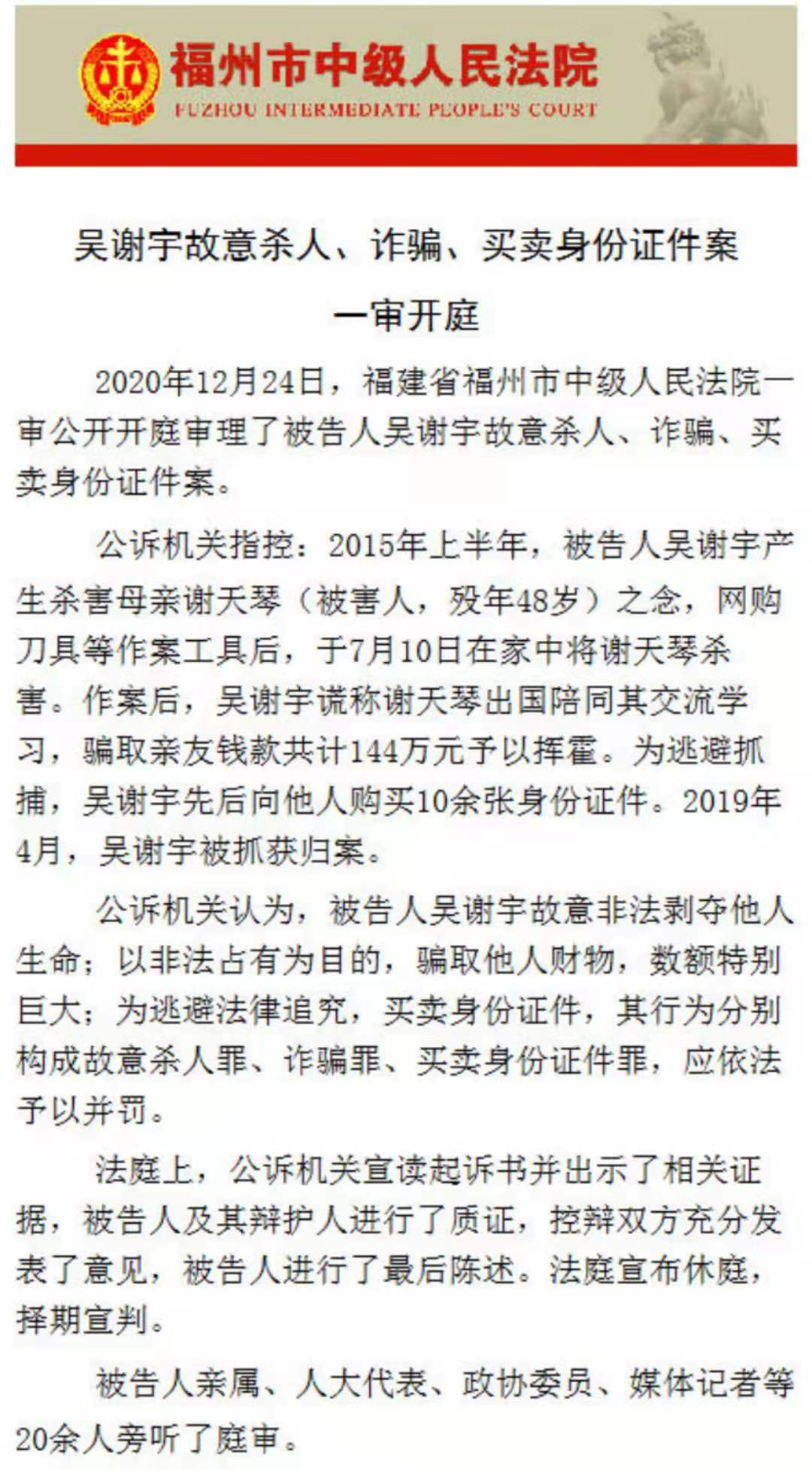 2020年12月24日上午9时整,福州市中级人民法院公开开庭审理被告人吴谢宇故意杀人罪一案。