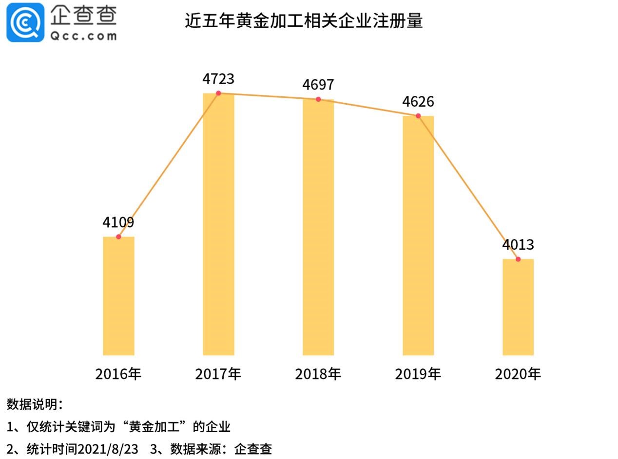 企查查数据显示,2016年黄金加工相关企业新注册量有4109家,2017年注册量达近5年来最高,共新增4723家,同比增长15%。往后三年注册量逐年下降,2020年注册量仅4013家,同比下降13%。