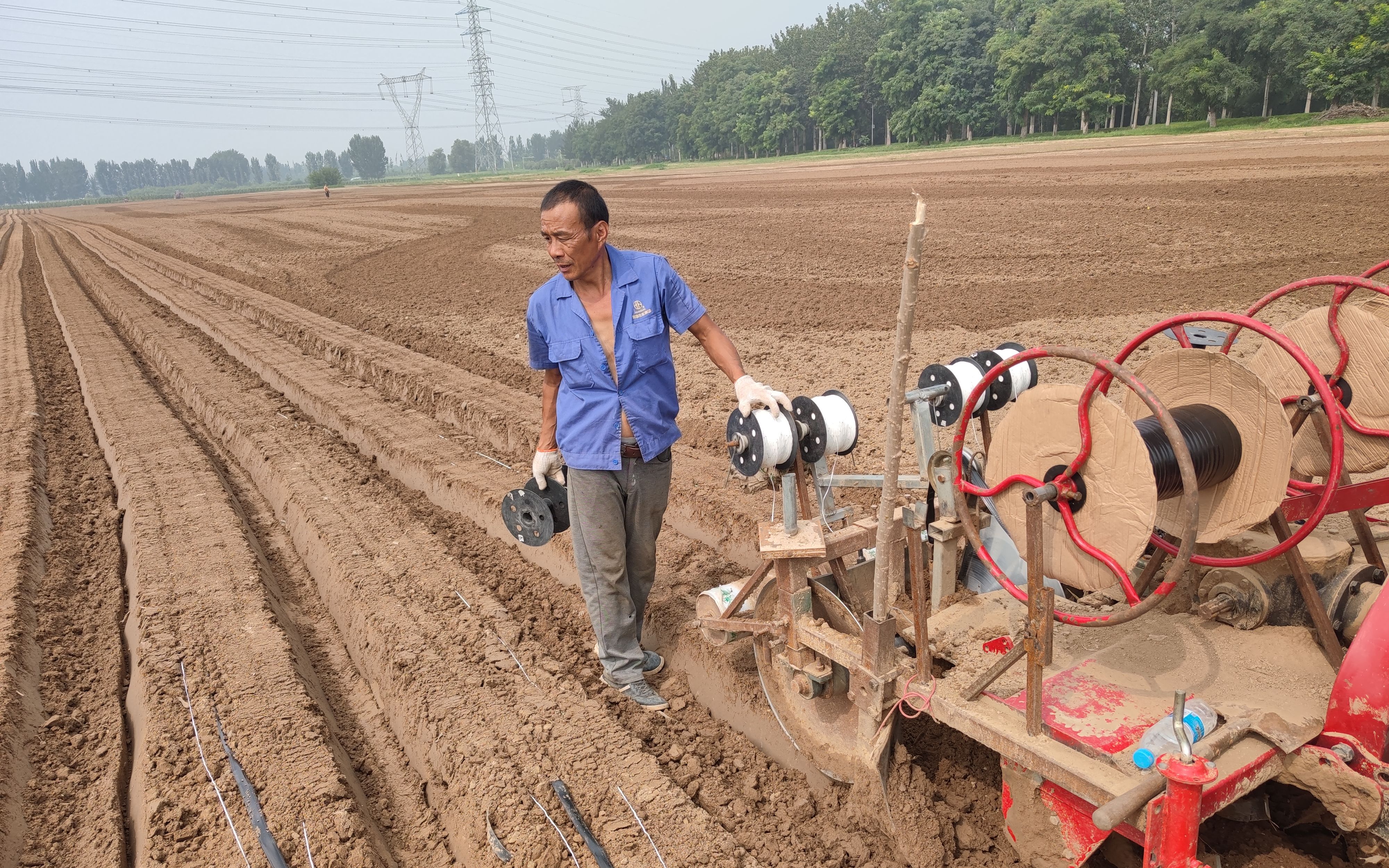 2500米长的纸线,被匀速行驶的播种机一点一点送进土壤里;齿轮之间,泥土翻起,形成一道道笔直的地垄,向天际延伸。8月22日,大兴区西白疃村临近机场高速的一块田地上,播种机在播种萝卜籽、铺设滴管带,机器过后,播种、滴灌铺设一次完成。