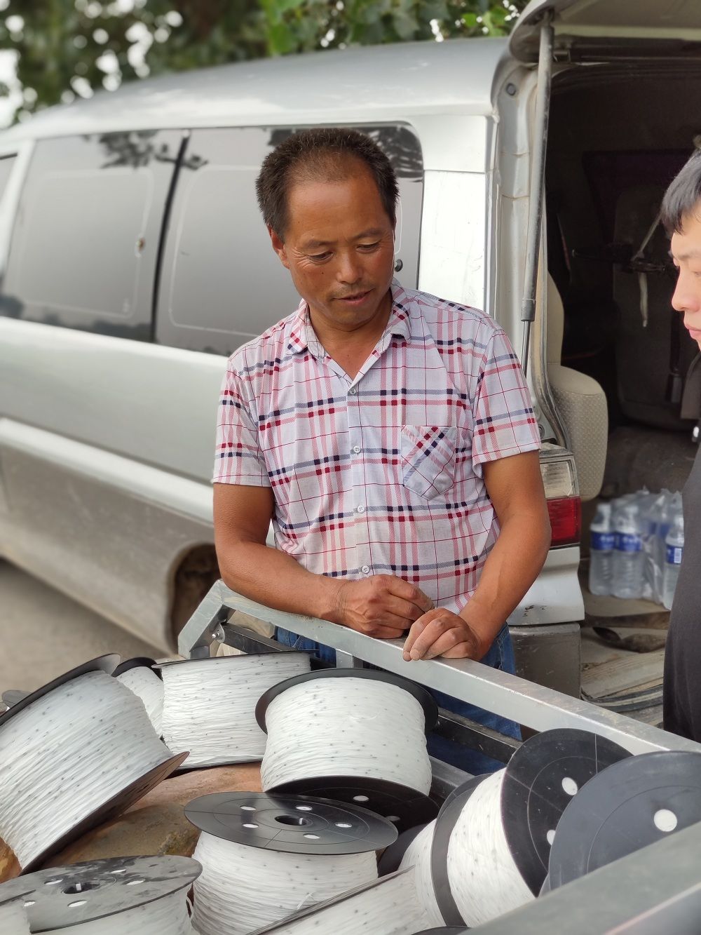 小杨的电动三轮车停在张力地头上,里面装着要卖给张力的种子带。种子带每2500米,缠绕在一个轮子上,一轮种子带的价格是120块钱。小杨这趟给张力送来23轮,“张大哥,你给2700就行。”