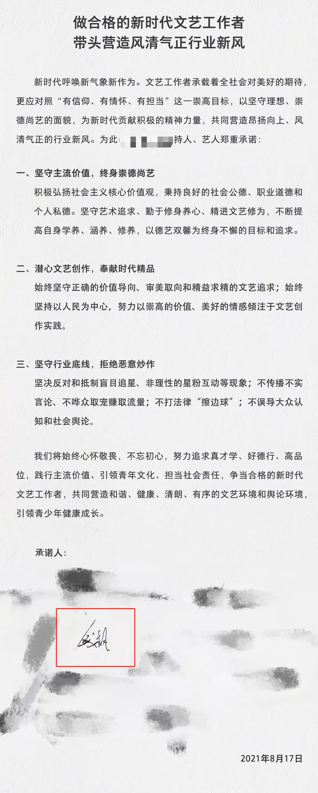 ▲8月17日,钱枫曾签艺人艺德承诺书。