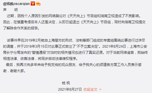 新京报讯 8月27日,钱枫在社交平台发布声明:“近期,因我个人原因引发的网络舆论对《天天向上》节目组和湖南卫视造成了不良影响。因此,在慎重考虑后本人还是决定,即日起退出《天天向上》节目组,同时向湖南卫视提交了解除合作关系的报告。”