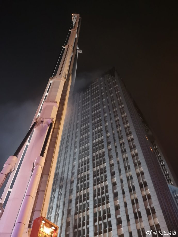 据“大连消防”官方微博消息:101米举高平台消防车持续对残火进行扫射。