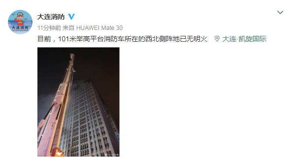 据“大连消防”官方微博消息:目前,101米举高平台消防车所在的西北侧阵地已无明火。