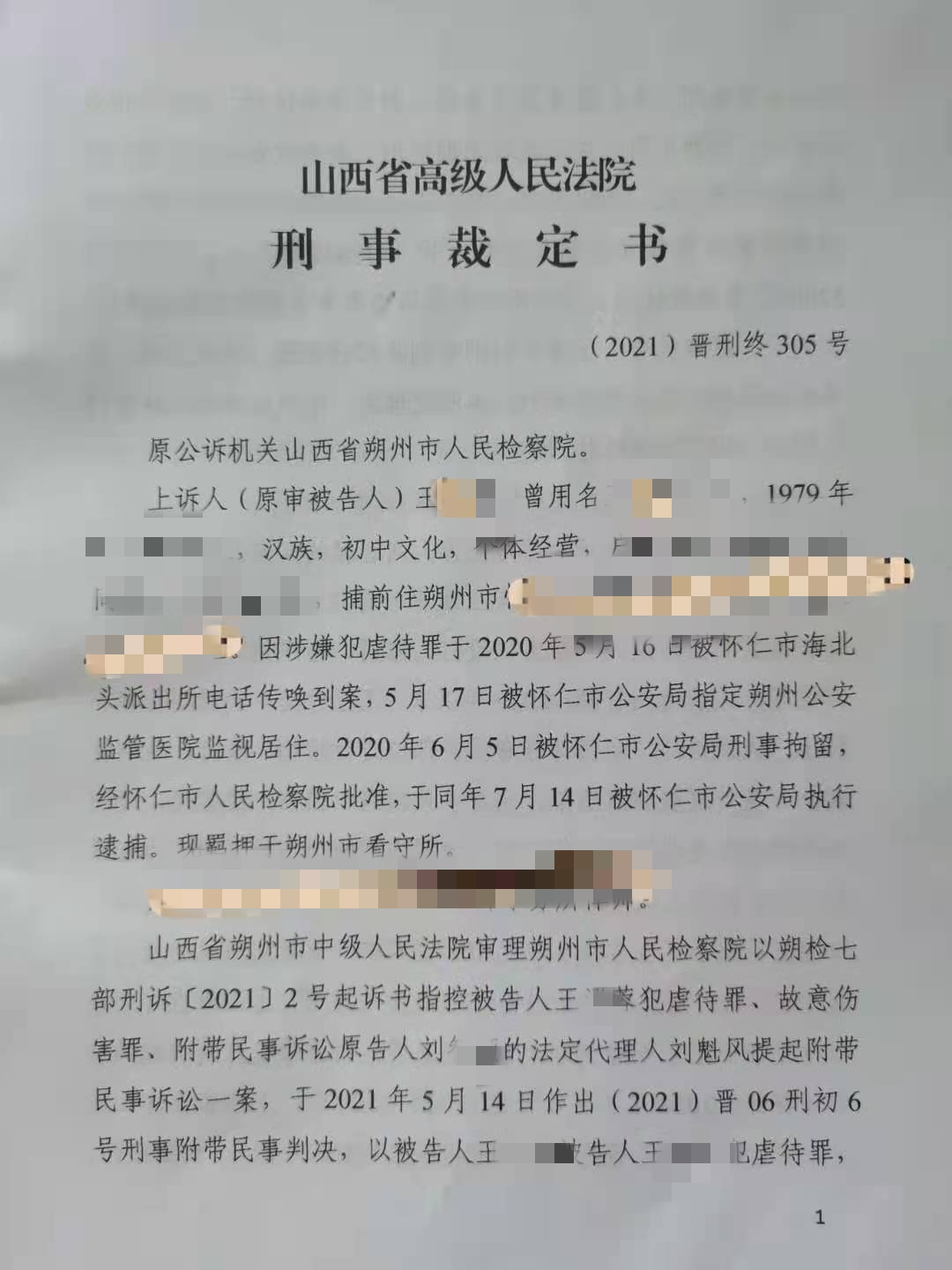 今年5月31日,本案一审在朔州中院开庭宣判,被告人王某蓉因犯虐待罪被判两年有期徒刑,因犯故意伤害罪被判无期徒刑,数罪并罚,决定执行无期徒刑。被告人王某蓉当庭表示上诉。